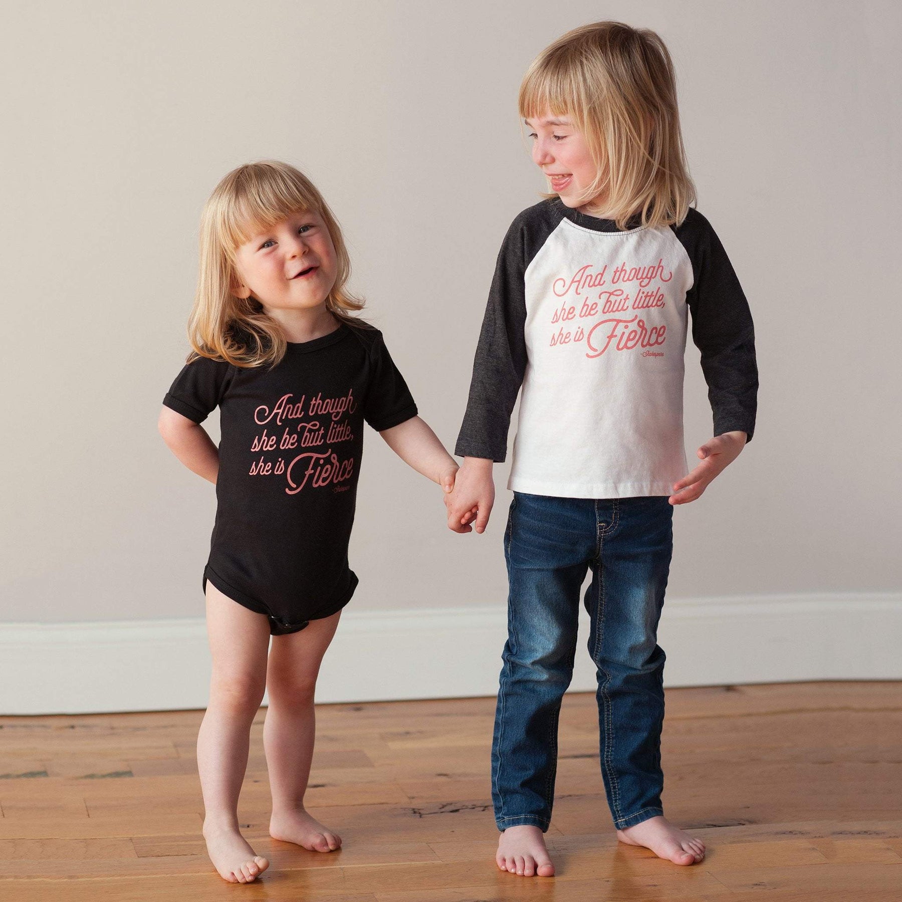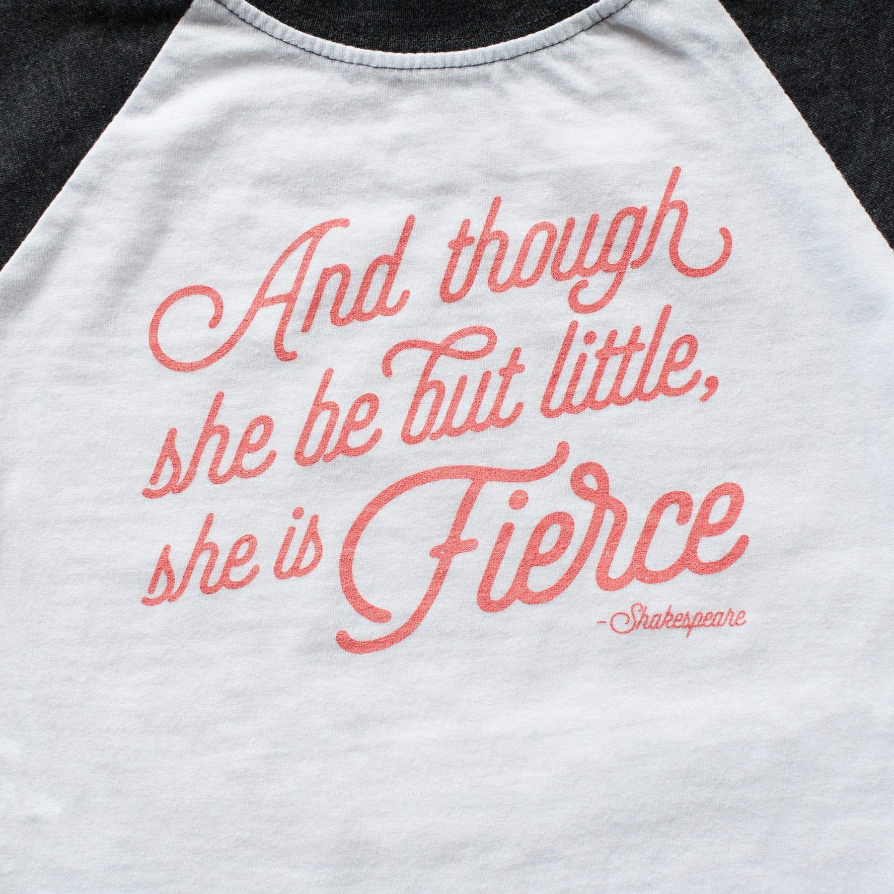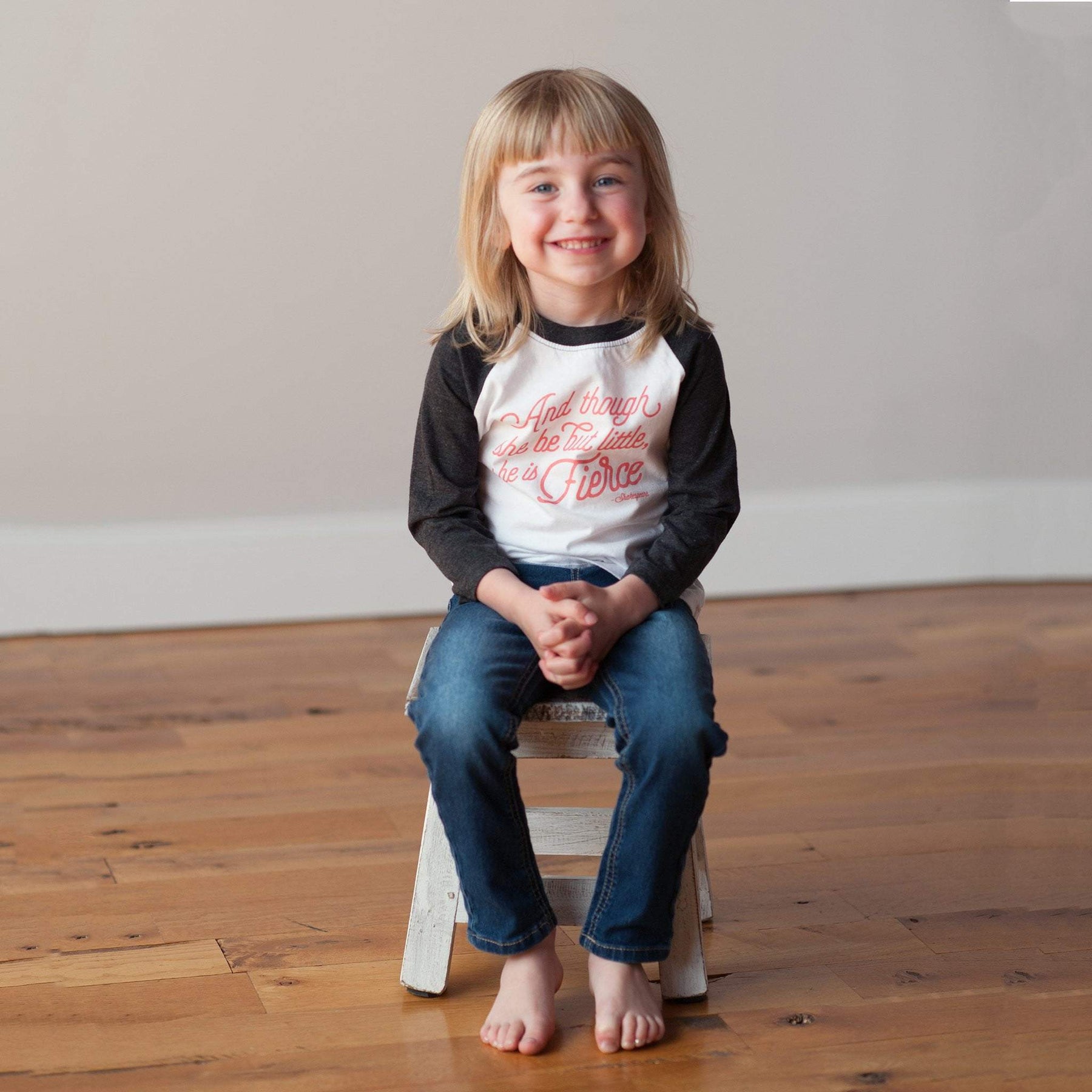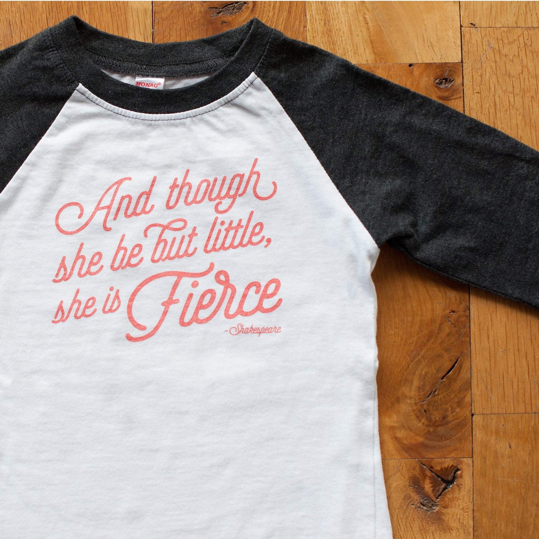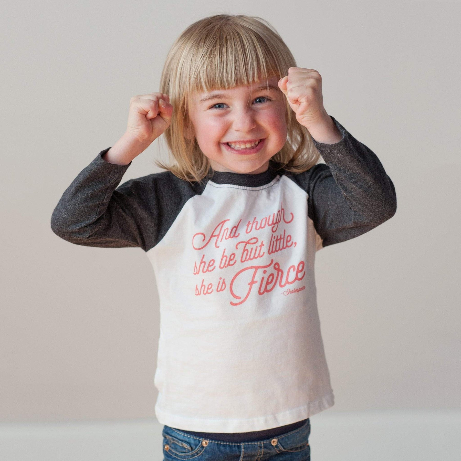 Your child will stand out and love wearing this super cute and unique raglan tee with Shakespeare quote: "And though she be but little, she is fierce." This 3/4 sleeve vintage black and white raglan tee is made from a lush high-quality cotton and poly blend fabric that feels soft and comfortable while remaining durable for everyday wear. A ribbed neck makes for hassle free outfit changes.