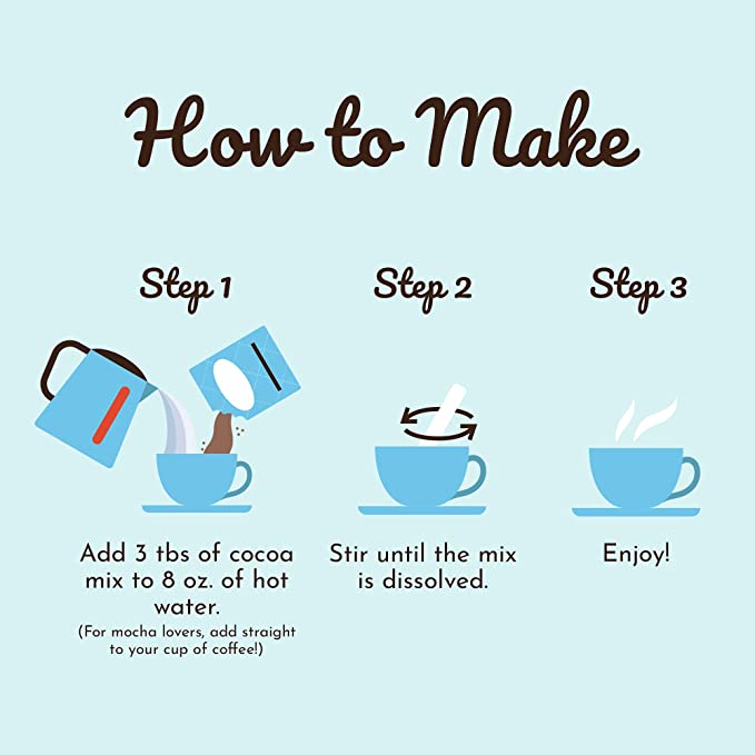 EASY TO MAKE: Add 3 T of mix to 8 oz of hot water. No milk necessary – only hot water needed and still tastes creamy & delicious. Same instructions if adding to your coffee for a mocha treat!