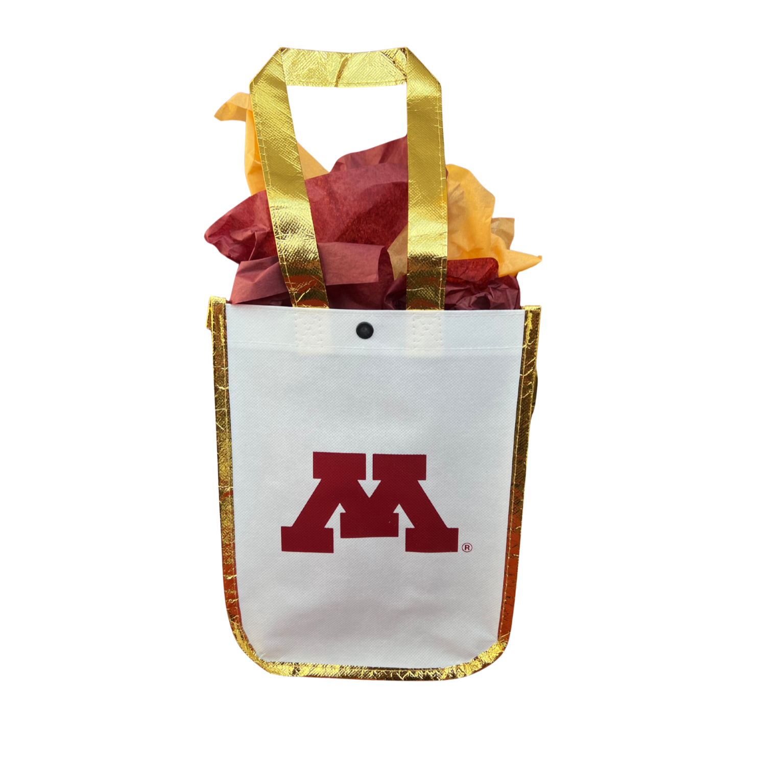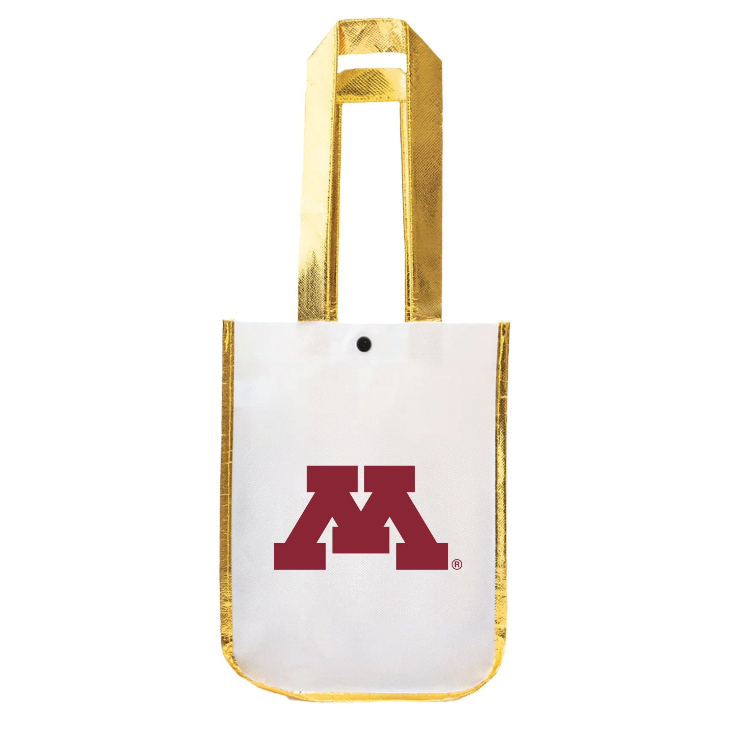 White bag features U of M logo in maroon with shiny gold handles, trim and gusset. On-trend curved bottom. (Tissue not included)