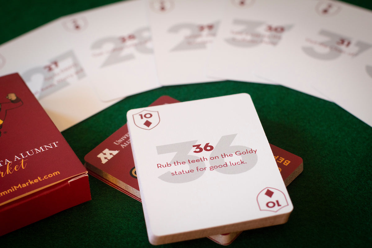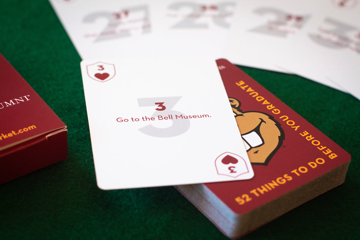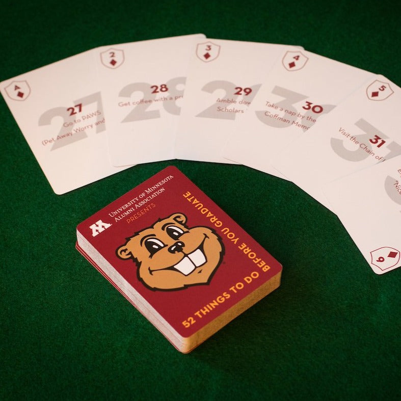A regular deck of 52 playing cards -- with the bonus of "52 Things to Do Before You Graduate" tips and challenges on the other side of each card!. The perfect gift for U of M students.
