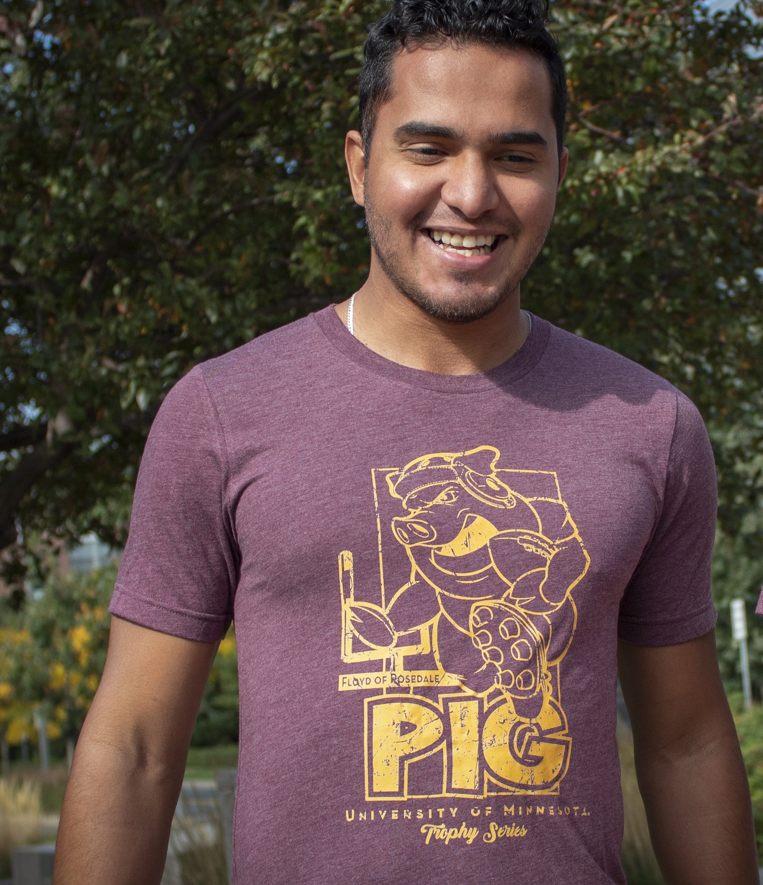 An important part of the football season is winning Floyd of Rosedale. With this shirt you have Floyd to proudly display at all times (even if he ends up in Iowa.) The shirt makes a statement in tailgating and stadium environments. Show your support for the Gophers!!