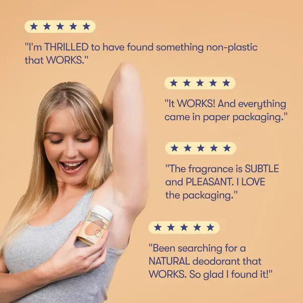 It delivers the assurance of all-day protection and performance—without the plastic. Don’t let the familiar oval shape fool you. Inside is a simple, push-up applicator (without the silly plastic mechanism)—and unique, natural fragrances. Ah, the smell of a plastic-free planet.