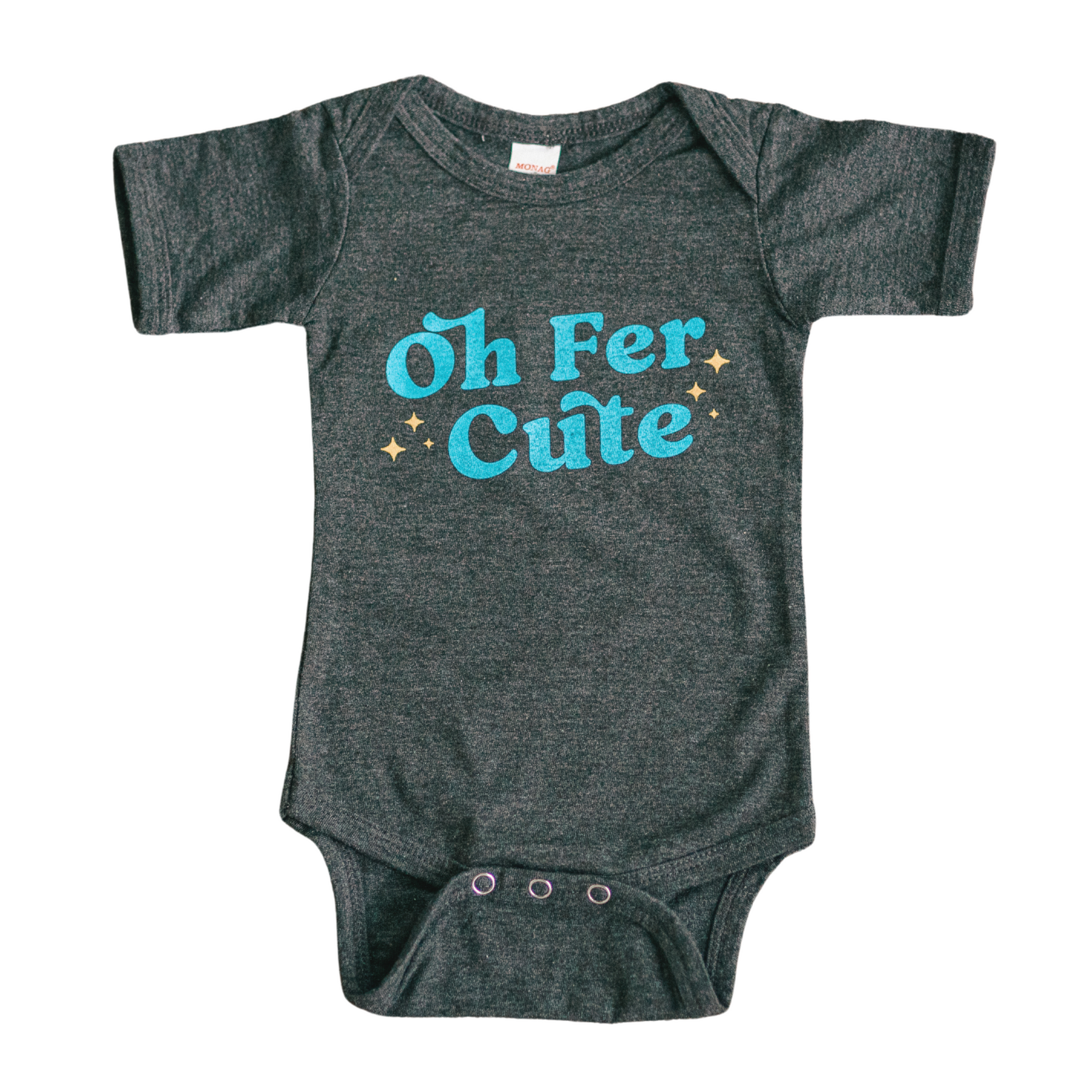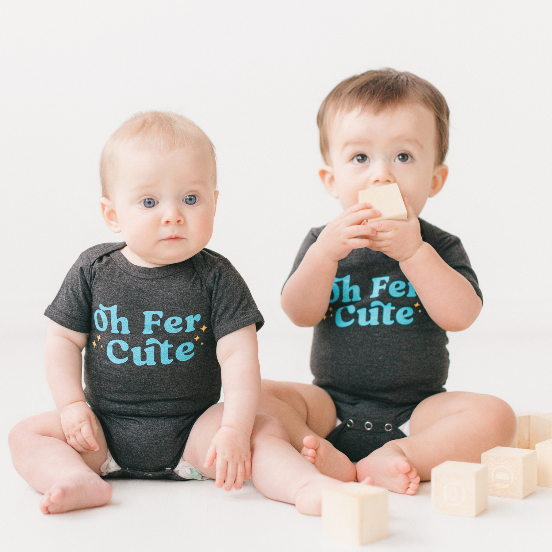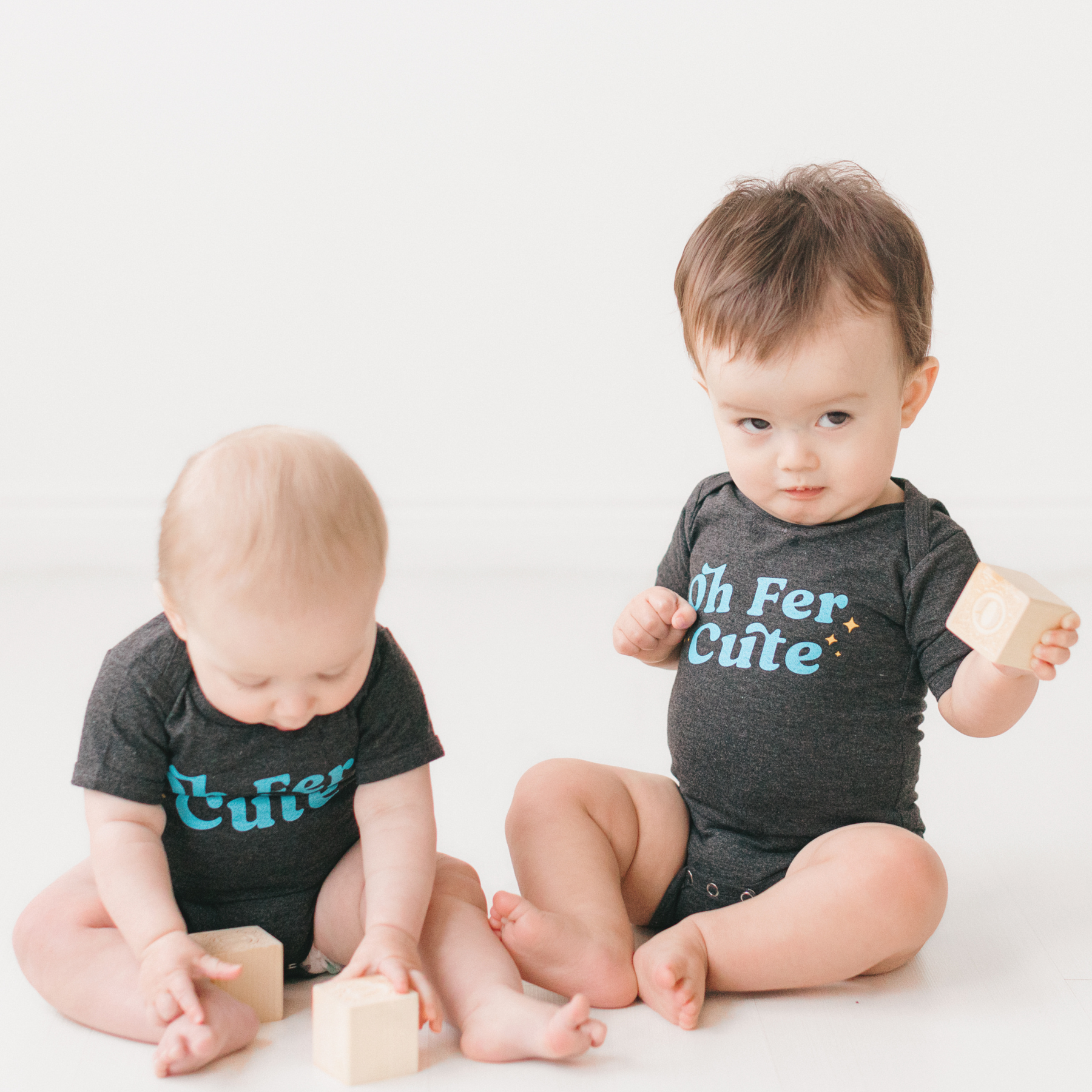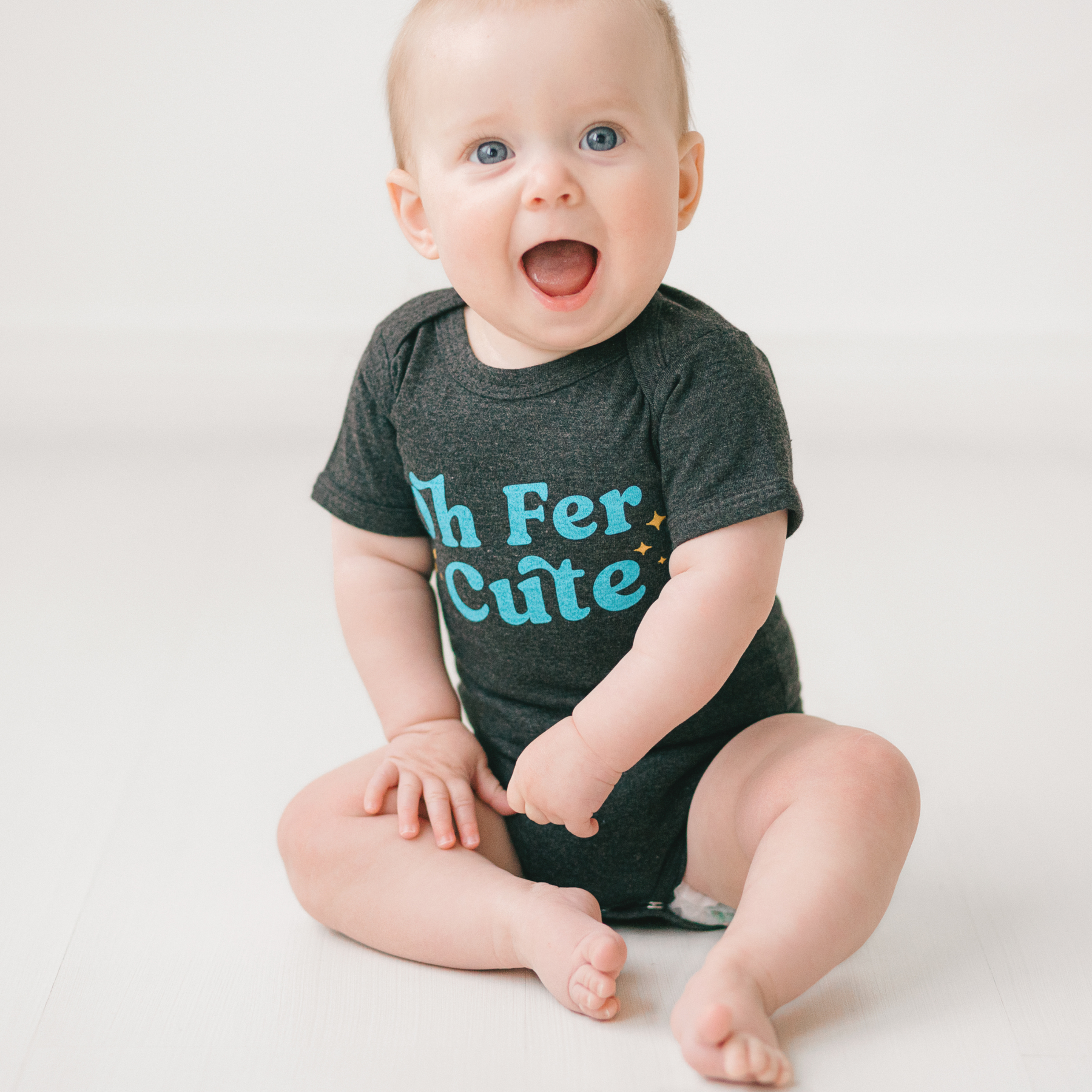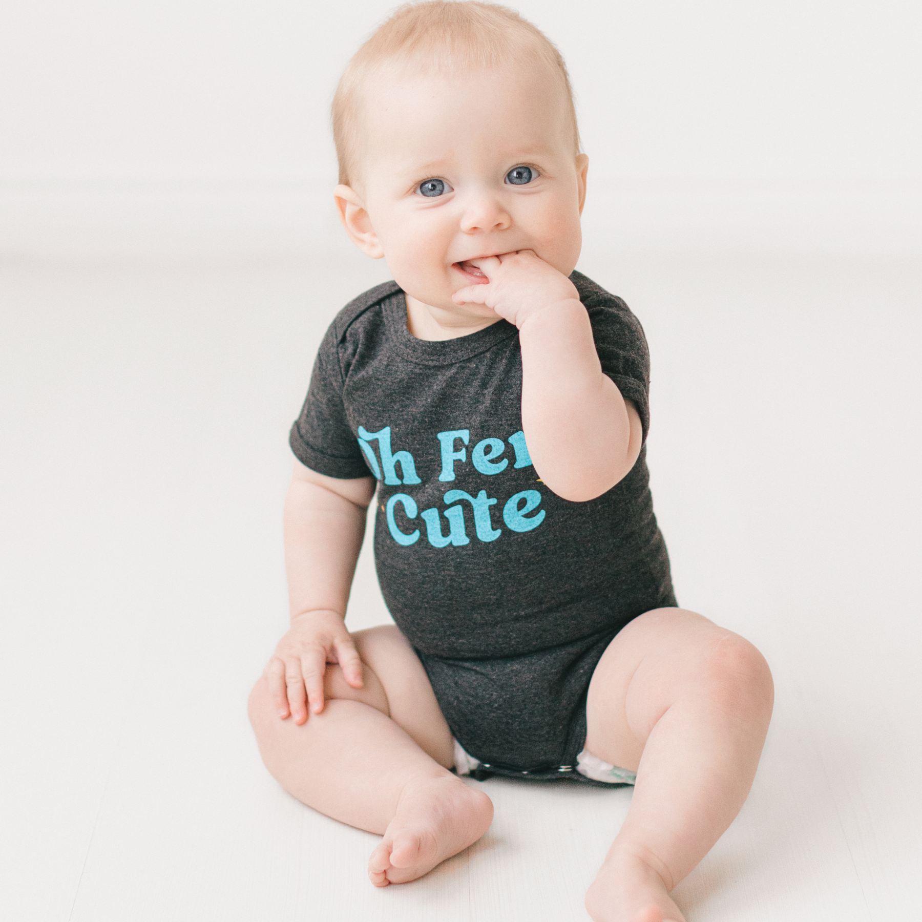 Short sleeved baby bodysuit in heathered black. Each bodysuit is professionally hand screen printed using vibrant blue and yellow lead and phthalate-free ink that holds up wash after wash. This is the perfect cool and adorable addition to your baby’s wardrobe.