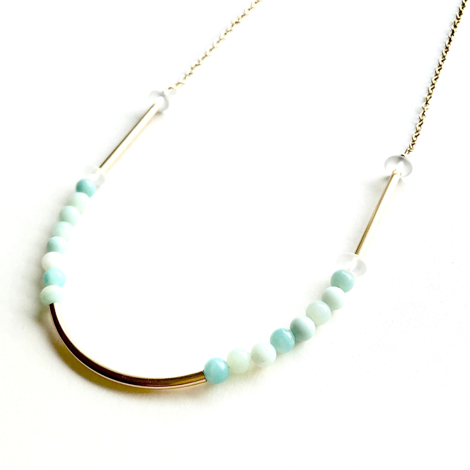 Amazonite is stone known to calm the spirit and soothe the soul. The various shades ofgreen and blue, bring back memories of the ocean and the 14k gold-fill reminds me of the warmth of the sun. Four matte quartz crystal beads anchor the tubes in place, and create a healing and beautiful piece to add to your jewelry collection.