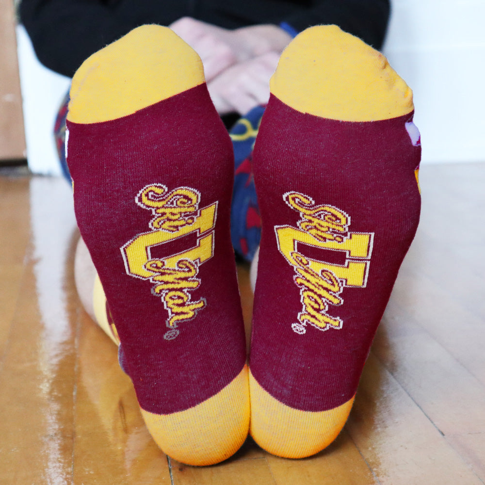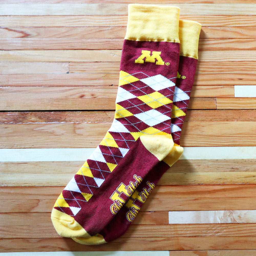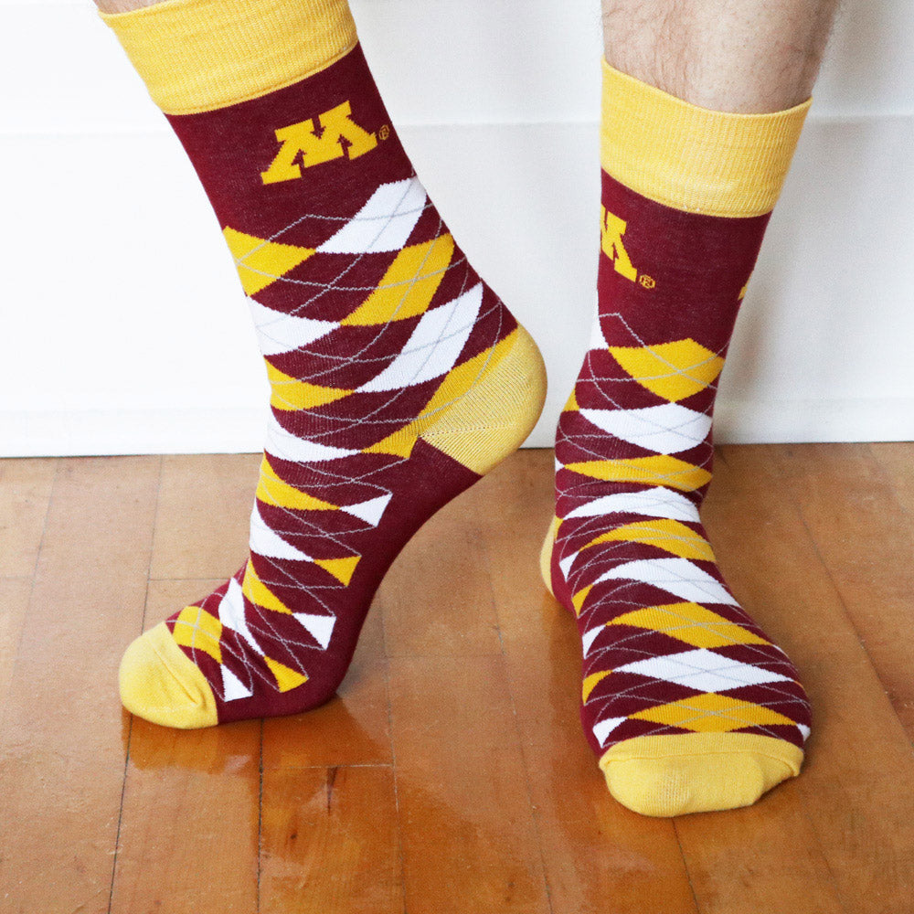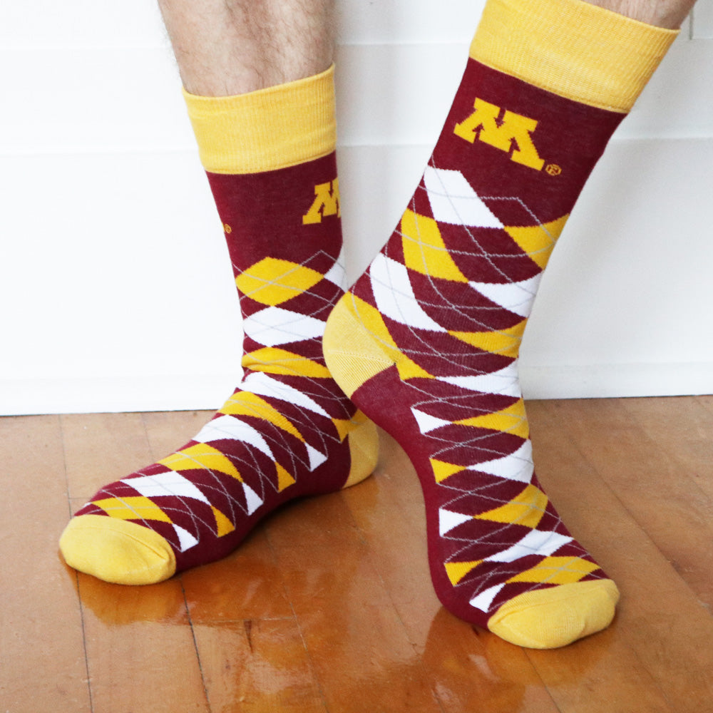 Maroon and gold argyle socks with Ski-U-Mah on the feet. So fun! Includes the M on the upper portion of this dress sock, so its got it all.