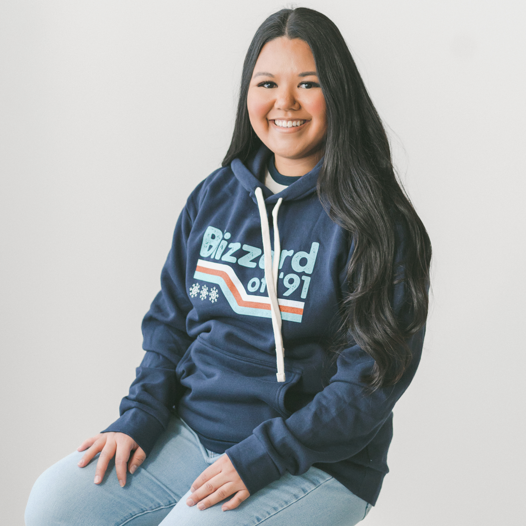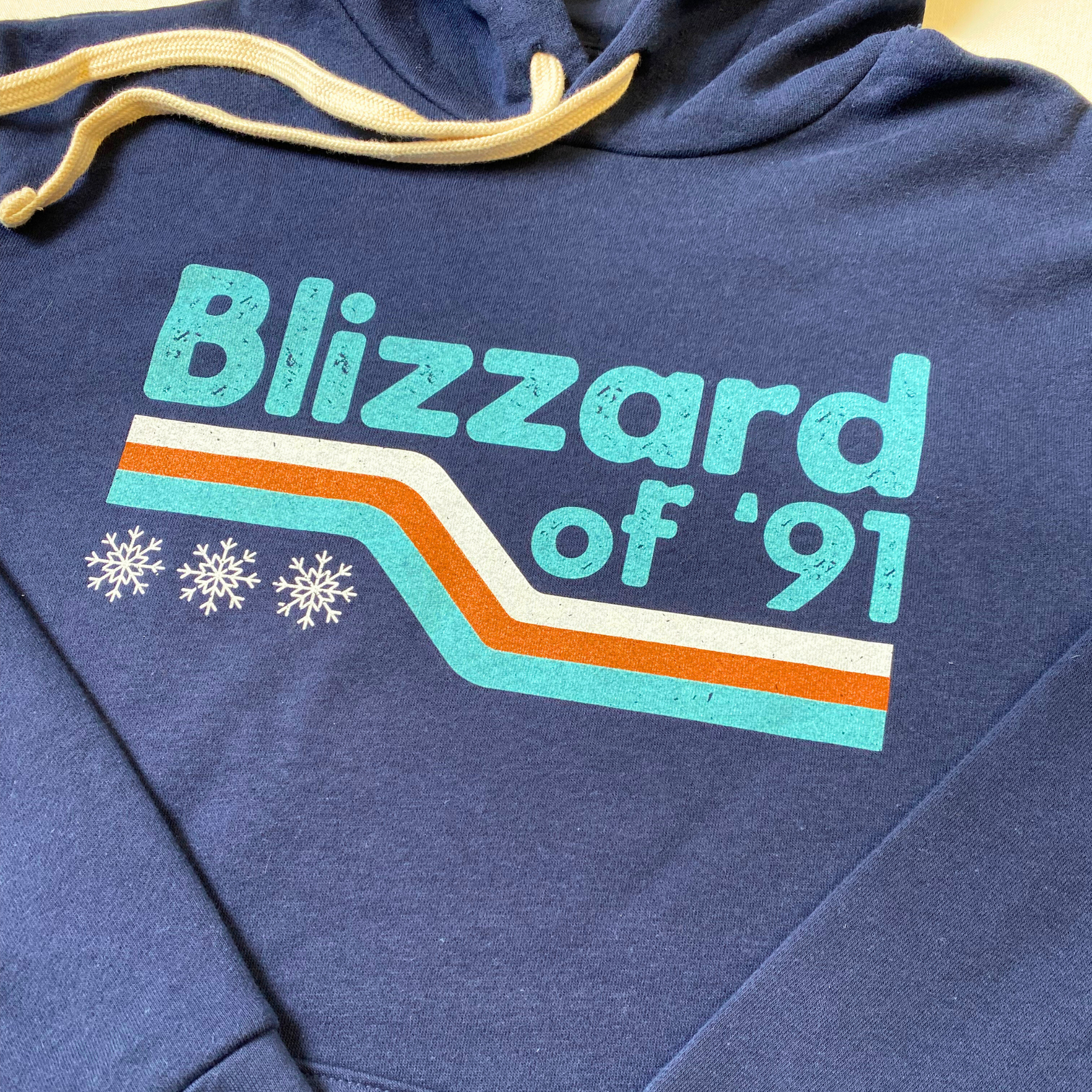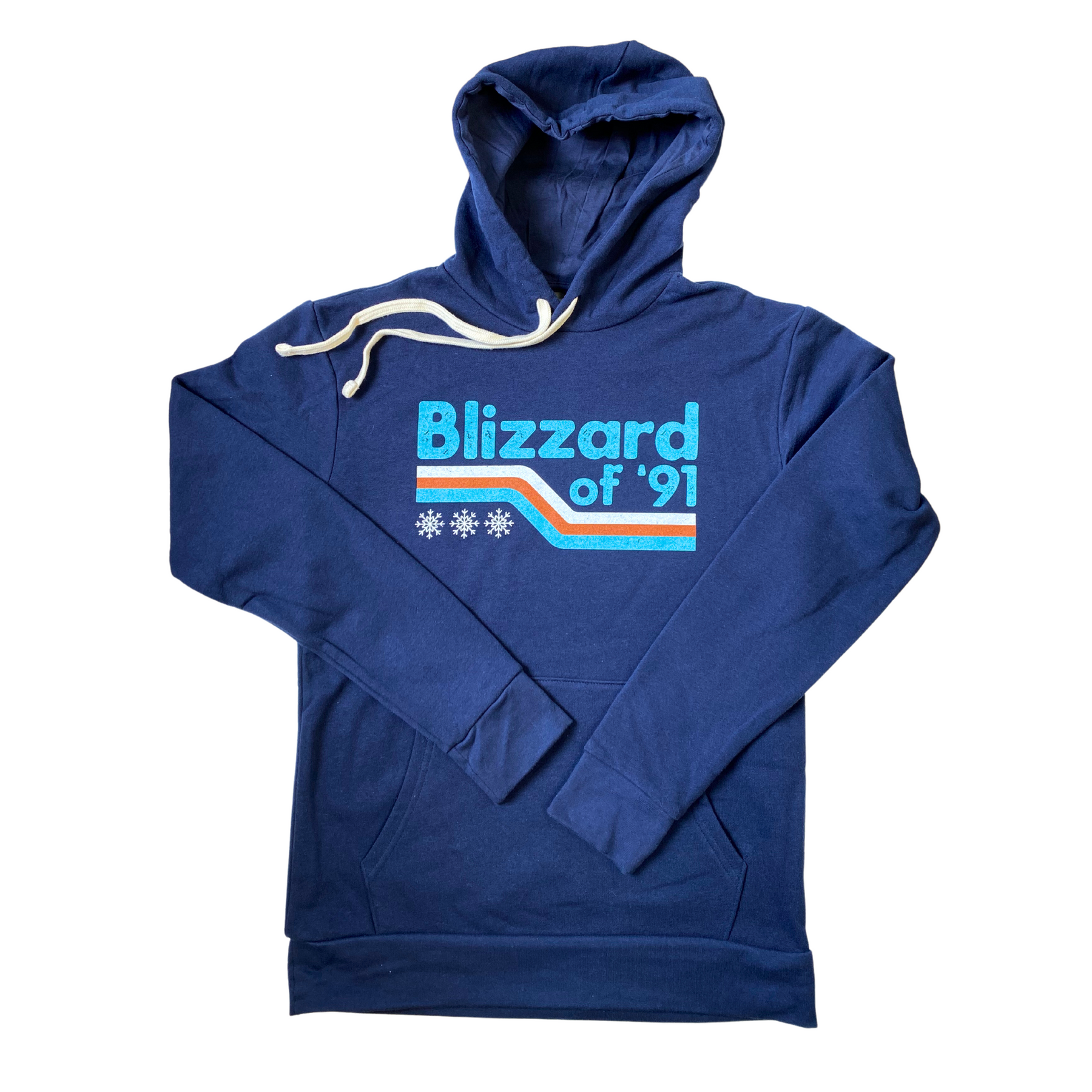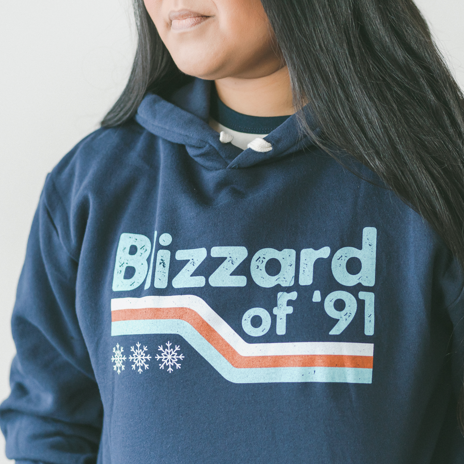 Millennial and older Minnesotans fondly remember where they were and what Halloween costume they were wearing during the infamous Halloween Blizzard of '91. Reminisce with your friends in our navy blue hoodie.