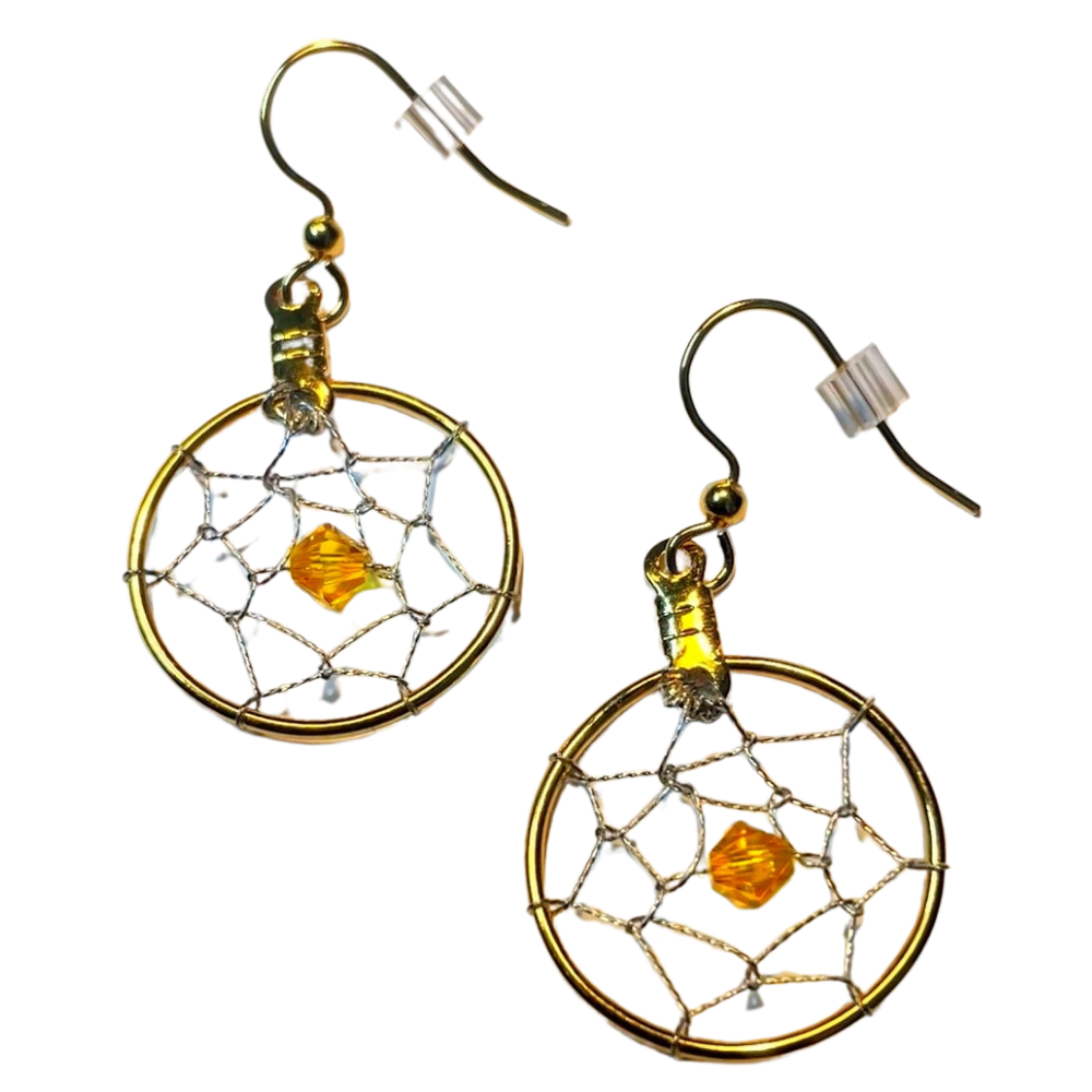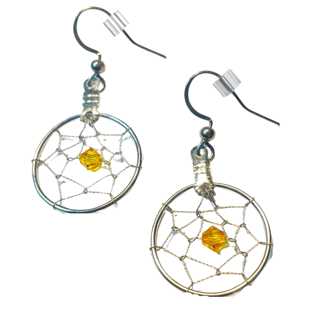 Earring hoop is metal and wrapped with tigertail. The earring measures 1-1/2” from top of earring wire to bottom of hoop. Earring wires are hypoallergenic and come with rubber backs for added security and attached to a Dream Catcher card. Stones are either Swarovski crystal or pearl.