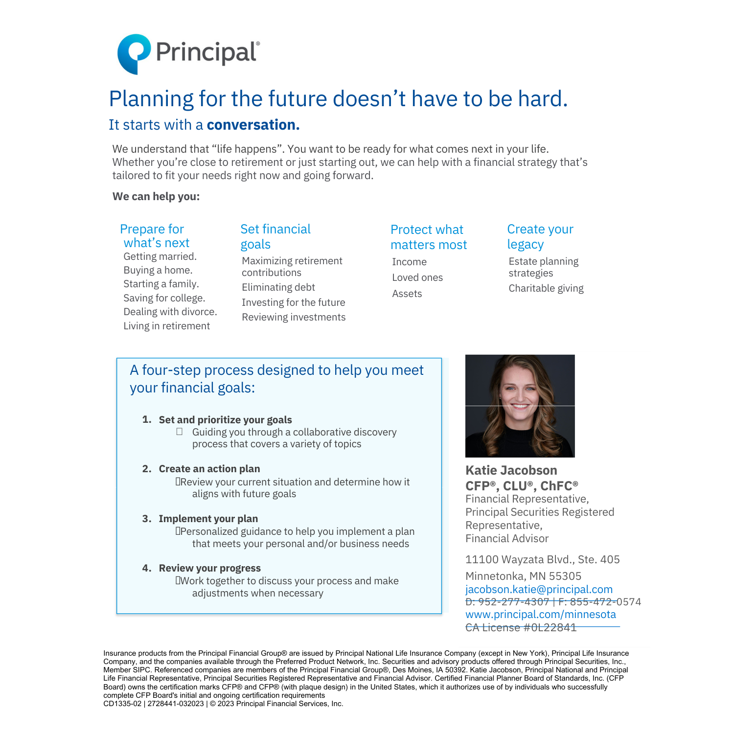 Insurance products issued by Principal National Life Insurance Company (except in NY), Principal Life Insurance Company®, and the companies available through the Preferred Product Network, Inc. Securities and advisory products offered through Principal Securities, Inc. member SIPC. Referenced companies are members of the Principal Financial Group®, Des Moines, IA 50392. Principal Securities Registered Representative. Katie Jacobson is not licensed in all states to offer securities and insurance products. This site is not a solicitation of interest in any of these products or service in any state which the registered representative is not properly licensed. Certified Financial Planner Board of Standards, Inc. (CFP Board) owns the certification marks CFP® and CFP® (with plaque design) in the United States, which authorizes use of by individuals who successfully complete CFP Board's initial and ongoing certification requirements.
