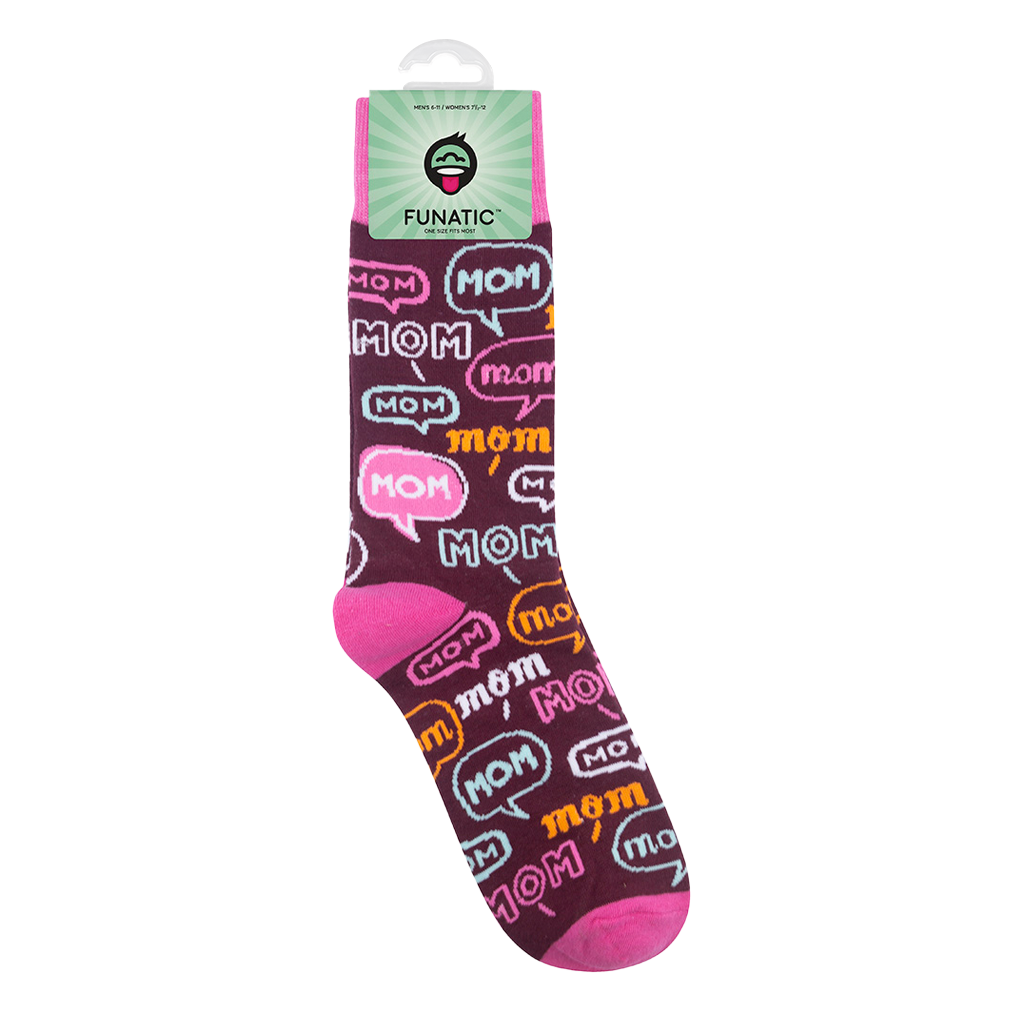 Set on a rich burgundy background, the design is a delightful explosion of chaos. Mom in pink, orange, and light blue bursts across the fabric, some wrapped in speech bubbles, just like they are in your actual life. A contrasting pink toe, heel, and cuff add to the cheerful, frazzled aesthetic.