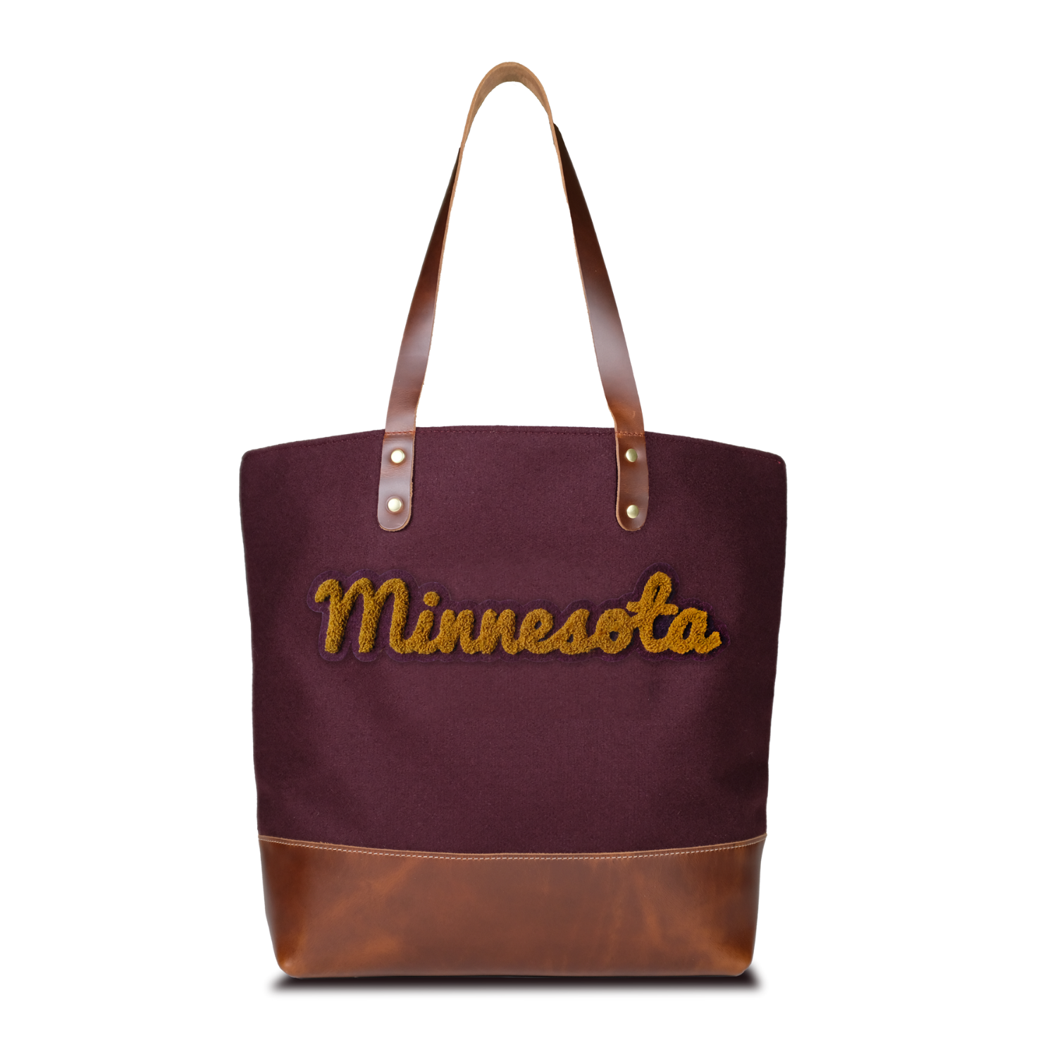 The University of Minnesota Script Tote Bag, proudly made in the USA, features rich heavyweight maroon Melton wool with a gold and maroon chenille "Minnesota" script patch on one side, and a gold and maroon chenille Block M.